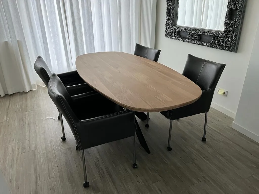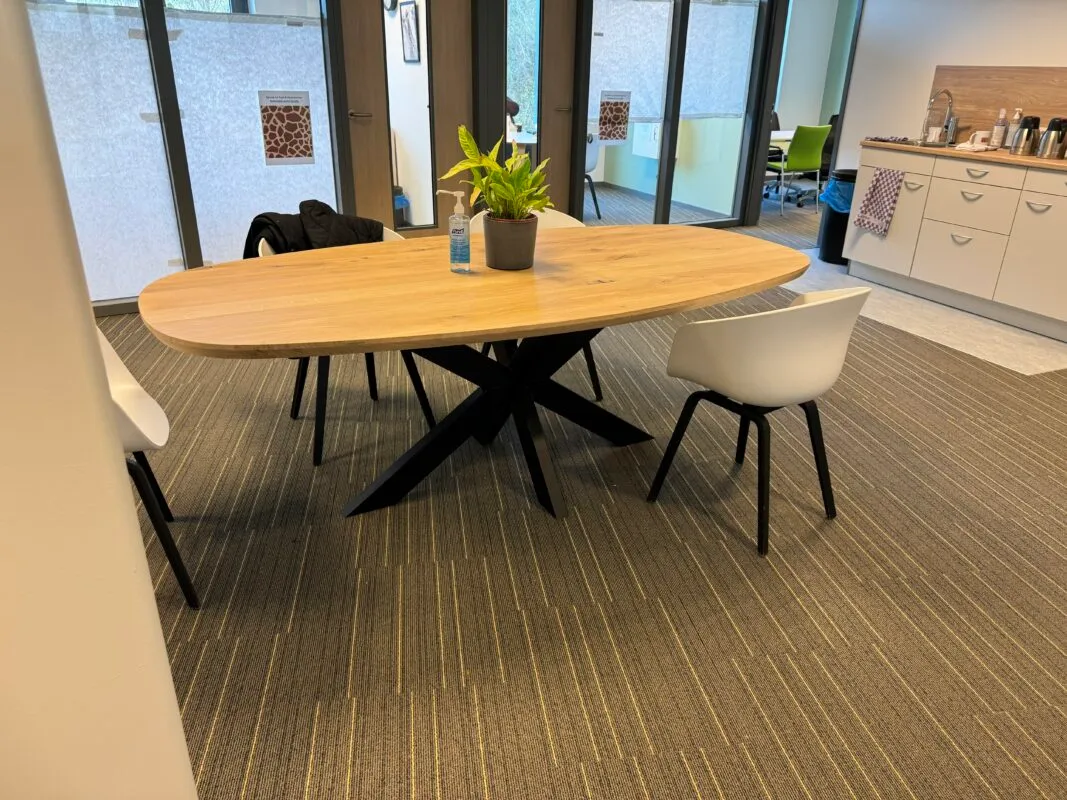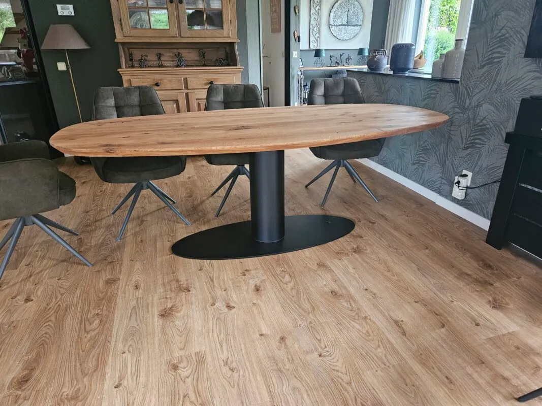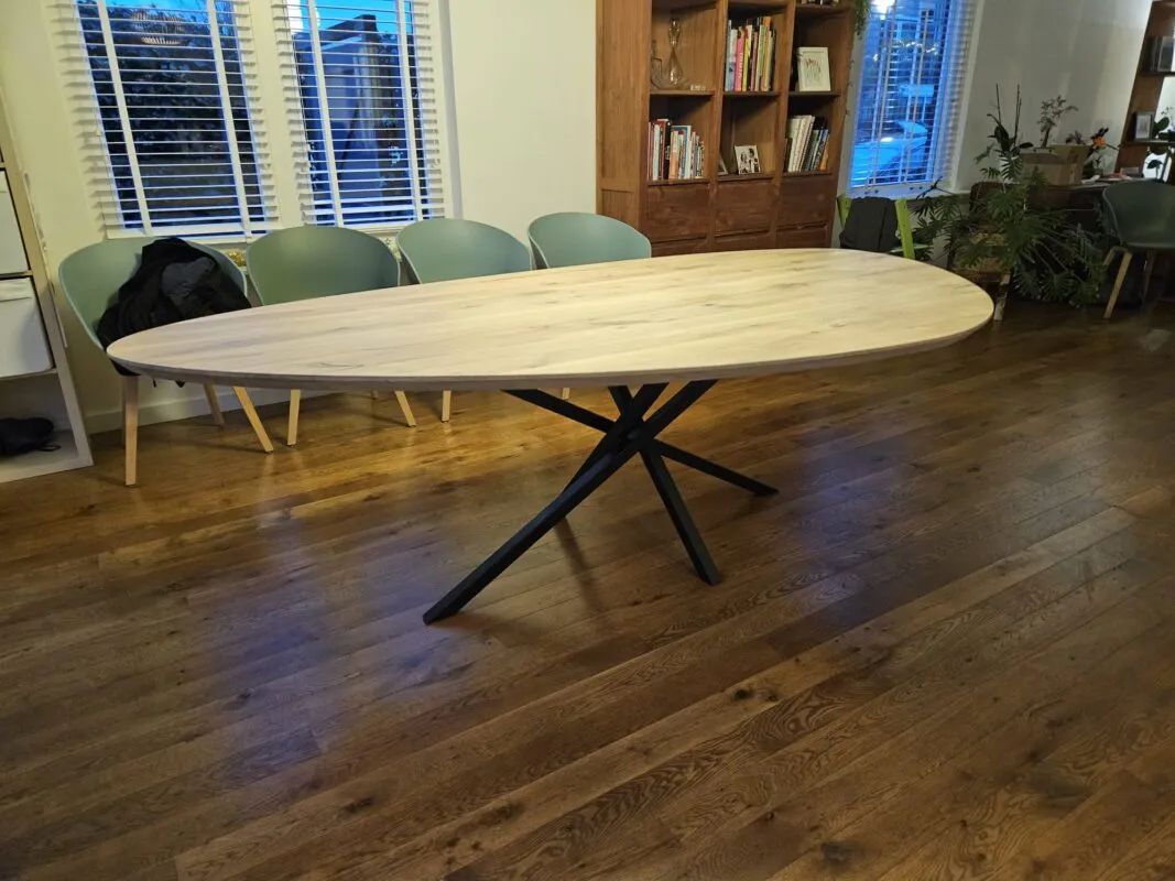 Eiken plat ovale tafel 220×100 – behandeling: Rubio monocoat VANILLA – Smalle matrixpoot