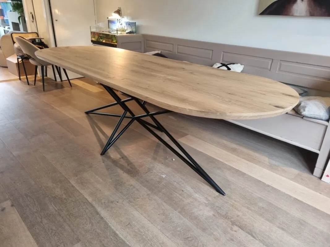 Eiken plat ovale tafel 300×100 – behandeling: Skylt lak – Ster onderstel
