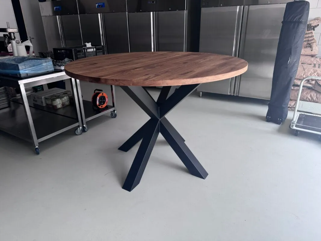 Eiken ronde tafel 130cm – behandeling: Rubio monocaot Castle Brown – Matrixpoot 5×5