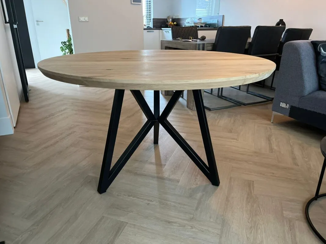 Eiken ronde tafel 130cm – behandeling: Skylt lak – Vlinder onderstel