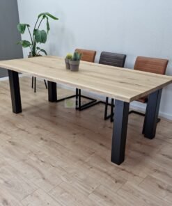 Het tafelblad is gemaakt van zorgvuldig geselecteerd eikenhout, waarbij de natuurlijke vormen en boomstamrand behouden blijven. Elke tafel is uniek dankzij de karakteristieke nerf, knoesten en kleurschakeringen. Door ambachtelijke afwerking krijgt het blad niet alleen een prachtige uitstraling, maar blijft het ook duurzaam en stevig.