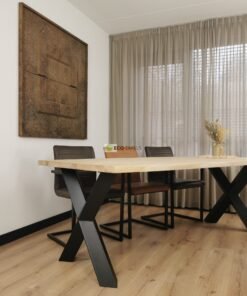 De Eikenhout boomstam tafel met Diamant X-poten is niet alleen een stijlvolle toevoeging aan je interieur, maar ook een praktische. De slimme plaatsing van het onderstel zorgt voor optimale beenruimte en comfort, terwijl het ontwerp van de tafel uitnodigt tot lange gesprekken, gezellige diners of productieve werkdagen.
