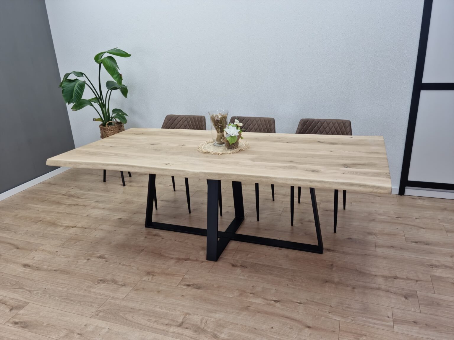 De eikenhouten boomstam tafel met dubbele U is meer dan alleen een meubelstuk. Het brengt de natuur in je huis, terwijl het tegelijkertijd zorgt voor een functionele eetruimte. De combinatie van het natuurlijke eikenhout en de moderne poten maakt dit meubel een ware eyecatcher.