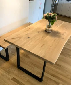 De boomstam tafel van eikenhout met smalle U-Poten past moeiteloos in verschillende interieurstijlen zoals industrieel, modern of Scandinavisch. Bijvoorbeeld, het natuurlijke hout voegt altijd warmte en rustieke charme toe, terwijl de smalle U-Poten de tafel een eigentijdse flair geven. Daarom is het een tijdsloze keuze voor elke ruimte in je huis.