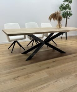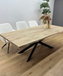 De boomstam tafel van eikenhout met Spider onderstel past moeiteloos in verschillende interieurstijlen zoals industrieel, modern of Scandinavisch. Bijvoorbeeld, het natuurlijke hout voegt altijd warmte en rustieke charme toe, terwijl het Spider onderstel de tafel een eigentijdse flair geeft. Daarom is het een tijdsloze keuze voor elke ruimte in je huis.