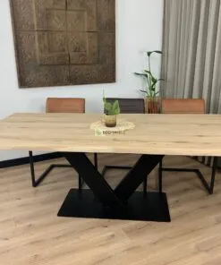 Het V-onderstel biedt een strak, modern ontwerp met een verfijnde uitstraling. Dit onderstel zorgt voor extra stabiliteit en een open, lichte sfeer in de ruimte, terwijl het tegelijkertijd de kracht en het karakter van het eikenhout benadrukt. De V-vormige poten geven de tafel een evenwichtig en elegant design dat perfect past in elke eetkamer.