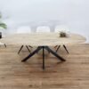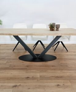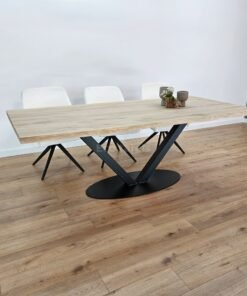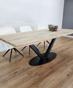 Het V-ovaal onderstel biedt een strak, modern ontwerp met een verfijnde uitstraling. Het ontwerp van dit onderstel zorgt voor stabiliteit en een open, lichte sfeer in de ruimte, terwijl het tegelijkertijd de kracht van het eikenhout benadrukt. De combinatie van het ovale, vloeiende ontwerp en de V-vormige poten zorgt voor een visueel evenwicht dat de tafel zowel elegant als functioneel maakt.