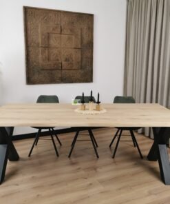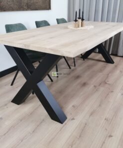 Deze tafel is meer dan alleen een meubelstuk; het is een kunstwerk. Het eikenhouten blad met de X-Poten brengt de natuur in je huis en biedt tegelijkertijd een functionele eetruimte. Kortom, het is niet alleen een tafel, maar een statement dat je interieur een extra dimensie geeft.