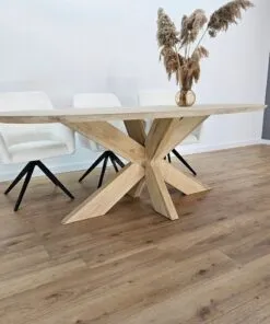 Het eiken onderstel biedt zowel stabiliteit als een warme, natuurlijke uitstraling. Het doordachte ontwerp zorgt ervoor dat de tafel een verfijnde, harmonieuze sfeer uitstraalt die perfect past in verschillende interieurstijlen. Dit onderstel maakt de tafel ideaal voor zowel kleinere als grotere eetkamers en voegt een subtiele esthetiek toe aan het geheel.