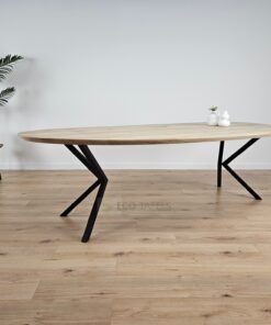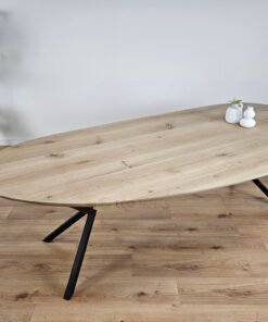 Het tafelblad is gemaakt van massief eikenhout en heeft een organische, natuurlijke vorm. Dankzij de unieke houtnerf, noesten en kleurnuances is elke tafel een waar kunstwerk. De zorgvuldige afwerking beschermt het blad tegen dagelijks gebruik, terwijl het zijn natuurlijke charme behoudt.