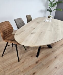 Het tafelblad is vervaardigd uit massief eikenhout met een organische, natuurlijke vorm. Elk blad is uniek dankzij de zichtbare houtnerf, kleurvariaties en noesten. Door de zorgvuldige afwerking blijft het blad jarenlang mooi en beschermd tegen dagelijks gebruik.