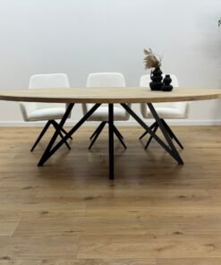 Het blad is vervaardigd uit hoogwaardig massief eikenhout, bekend om zijn duurzaamheid en karakteristieke houtnerf. De ovale vorm zorgt voor een vriendelijke, open sfeer en maakt de tafel perfect voor sociale momenten. Elke tafel is uniek en wordt met vakmanschap afgewerkt met een beschermende olie of lak.