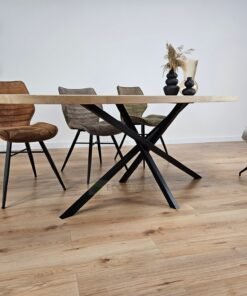 Deze tafel past uitstekend binnen moderne, industriële of Japandi interieurs. De combinatie van natuurlijke materialen met het grafische onderstel zorgt voor een harmonieus geheel dat zowel rust als karakter toevoegt aan de ruimte.