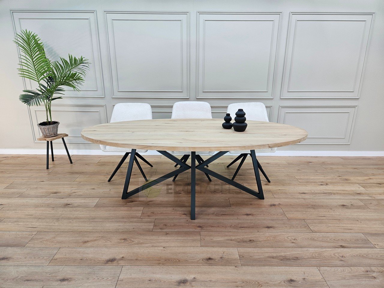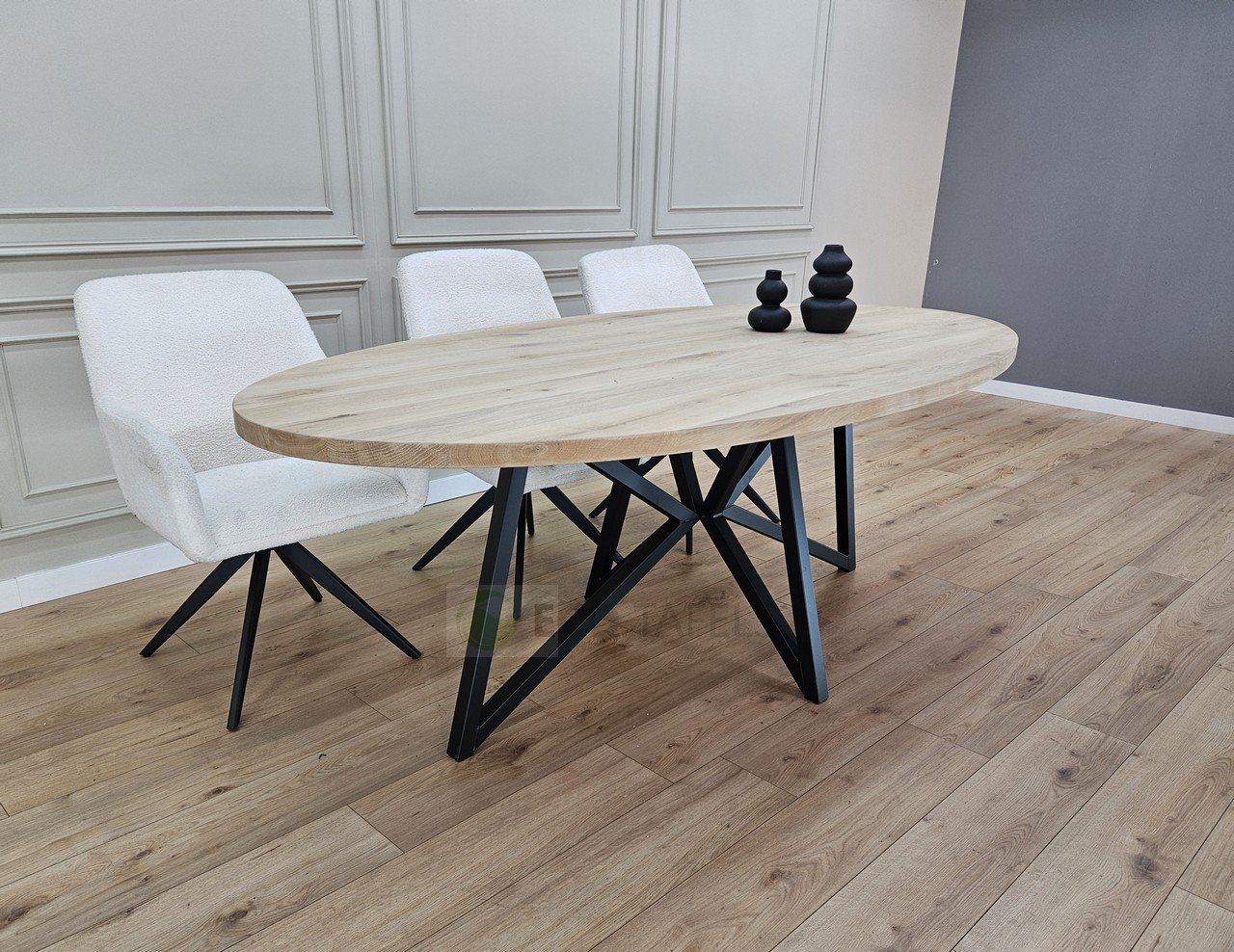 Het blad is gemaakt van hoogwaardig massief eikenhout. De natuurlijke nerf, kleurnuances en subtiele noesten maken elke tafel uniek. De ovale vorm zorgt voor een vriendelijke, toegankelijke uitstraling en bevordert sociale interactie aan tafel. Bovendien is het blad behandeld met een beschermende olie of lak om het bestand te maken tegen vlekken en dagelijks gebruik.