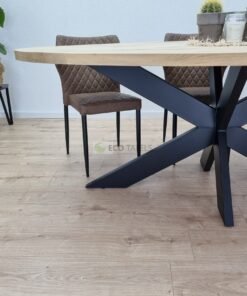 Hierdoor ontstaat een harmonieus geheel: robuust hout gecombineerd met een modern onderstel.