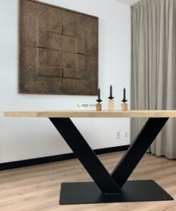 Het V-poot onderstel bestaat uit twee poten die in een elegante V-vorm onder het tafelblad geplaatst zijn. Dit ontwerp biedt niet alleen een stabiele constructie maar zorgt ook voor veel beenruimte en een lichte, moderne uitstraling. Het onderstel is gemaakt van gepoedercoat staal en vormt een fraai contrast met het warme eikenhout.