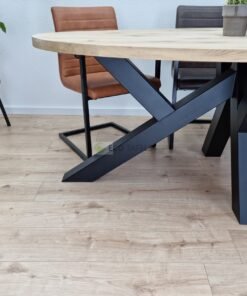 Het W-onderstel bestaat uit twee robuuste poten die in een ‘W’-vorm zijn verbonden. Dit zorgt voor een stevige constructie met een grafisch en modern uiterlijk. Het onderstel is vervaardigd uit gepoedercoat staal en vormt een mooi contrast met het warme eikenhout van het blad.