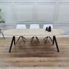 Het Dubbele L onderstel bestaat uit twee robuuste, stalen poten in L-vorm. Deze staan gespiegeld tegenover elkaar en zorgen voor een stabiele, symmetrische basis. Dankzij het open ontwerp blijft de tafel luchtig ogen, terwijl het staal juist kracht en structuur toevoegt.