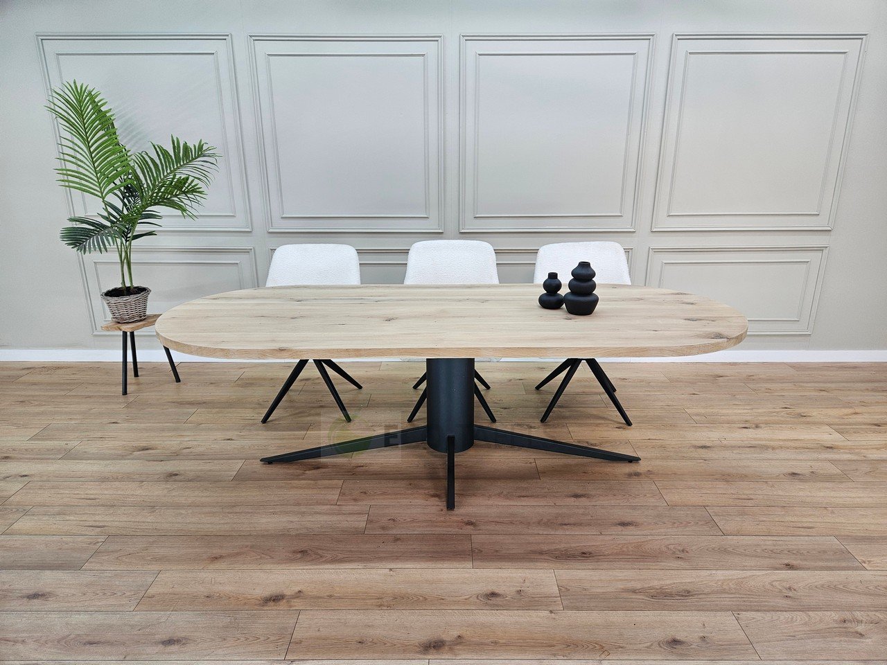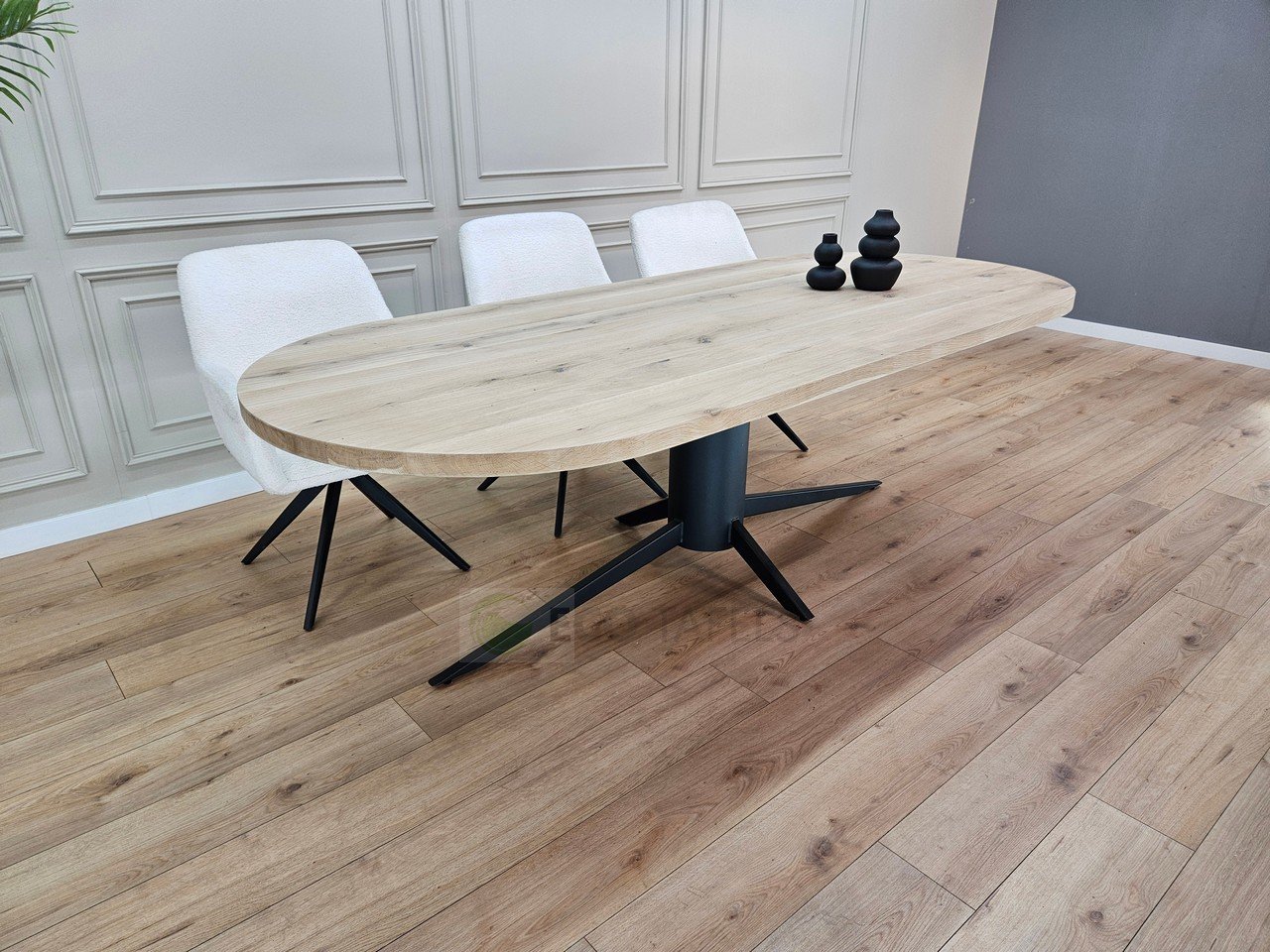 De Eiken plat ovale tafel met Otrix onderstel past perfect in diverse interieurstijlen. Denk aan Scandinavisch, modern, industrieel of Japandi. De mix van hout en metaal geeft de tafel een veelzijdig karakter dat zowel rust als kracht uitstraalt.