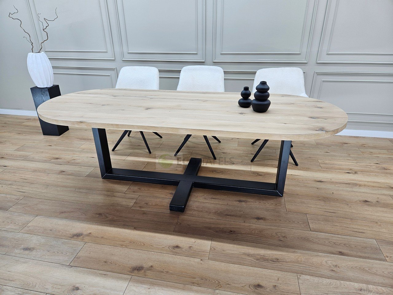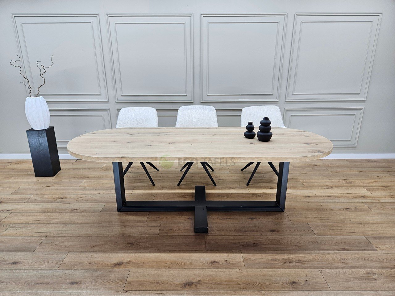 Eiken plat ovale tafel met Plus Frame – Tijdloos Design met Industriële Kracht