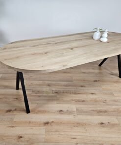 De Eiken plat ovale tafel met Scissor poten is een uniek meubelstuk dat elegantie en functionaliteit samenbrengt. Perfect voor wie houdt van een speels, modern design met een warme, natuurlijke touch.