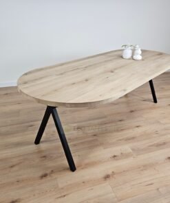 Eiken plat ovale tafel met Scissor poten – Dynamiek en Natuurlijke Warmte in Één