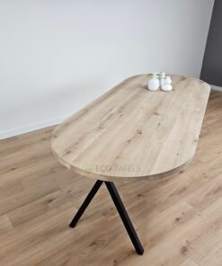 Het plat ovale tafelblad heeft rechte zijkanten met afgeronde uiteinden, wat zorgt voor een moderne, strakke maar toch zachte vorm. Het blad is gemaakt van massief eikenhout met een natuurlijke nerf en unieke kleurvariaties. Iedere tafel is daardoor een uniek meubelstuk.