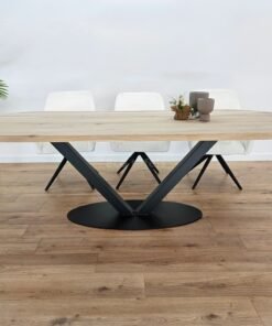De V-Poot in ovale vorm is een centraal geplaatst onderstel met een elegante, open structuur. Het stalen frame vormt een strakke V die rust op een ovale voetplaat. Hierdoor krijgt de tafel een moderne en luchtige uitstraling, zonder in te leveren op stabiliteit.