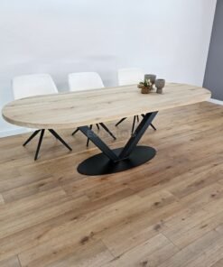 De Eiken plat ovale tafel met V-Poot ovaal is een stijlvol statement in je interieur. Ze brengt warmte, stabiliteit en verfijning samen in één krachtig ontwerp.
