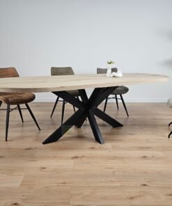 Het plat ovale tafelblad heeft rechte zijden met zacht afgeronde uiteinden, wat zorgt voor een frisse en uitnodigende vorm. Gemaakt van massief eikenhout met zichtbare nerven en unieke kleurvariaties, is elk blad een uniek kunstwerk. De beschermende afwerking voorkomt beschadigingen en houdt het blad gemakkelijk schoon.