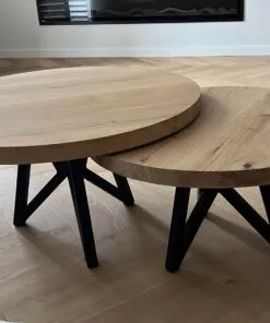 De eiken ronde salontafel set met vlinder onderstel combineert de warme uitstraling van massief eikenhout met een uniek en strak vlinder metalen onderstel. Dit design geeft de set een moderne, elegante en stabiele basis die perfect past in diverse interieurstijlen.