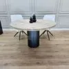 De combinatie van de ronde vorm, warme houttinten en het stoere, ronde matrixonderstel geeft de tafel een modern en toch tijdloos karakter. De centrale poot maakt het mogelijk om comfortabel rondom te zitten, zonder dat poten in de weg staan.