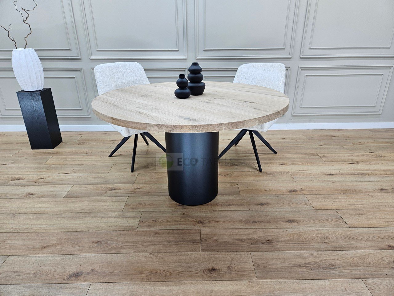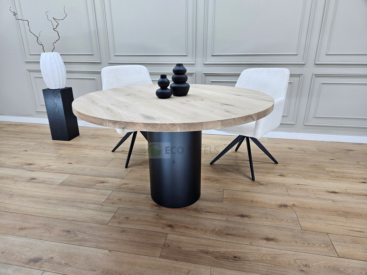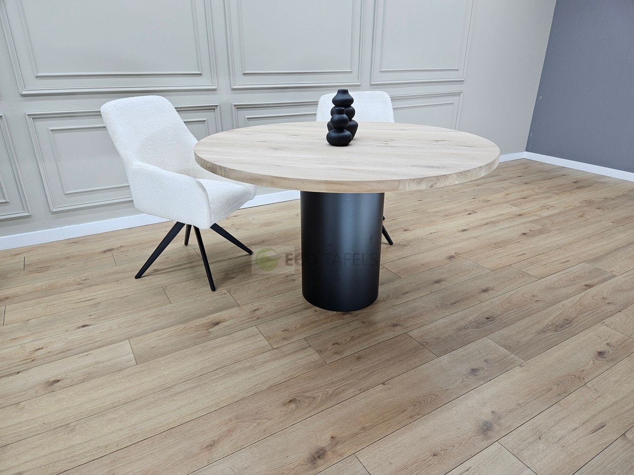 Eiken Ronde Tafel met Buis Onderstel – Minimalistisch en Krachtig Design