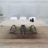 Dankzij de afgeronde hoeken van het tafelblad ontstaat een comfortabele en vriendelijke vorm, zonder scherpe randen. De hoge Kik poten geven de tafel een elegante hoogte en versterken de minimalistische uitstraling. Dit maakt de tafel ideaal voor moderne interieurs waarin functionaliteit en design samenkomen.