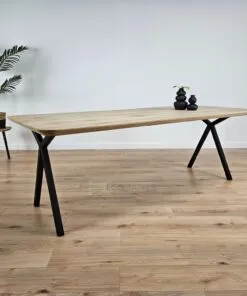Eiken Tafel met Afgeronde Hoeken en Scissor-Poten – Stoer en Uniek
