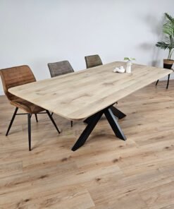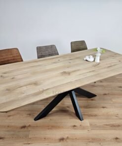 Het tafelblad is vervaardigd uit duurzaam massief eikenhout met een warme kleur en een karaktervolle nerf. De ambachtelijke afwerking garandeert dat de tafel jarenlang mooi blijft, ook bij intensief gebruik.