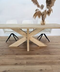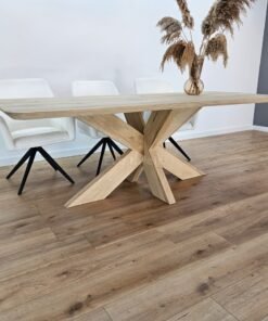Het tafelblad is vervaardigd uit duurzaam massief eikenhout met een warme kleur en een karaktervolle nerf. De zorgvuldige afwerking benadrukt de natuurlijke schoonheid en zorgt ervoor dat de tafel jarenlang meegaat.