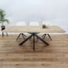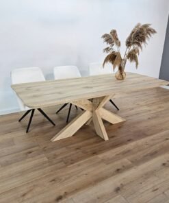 Dankzij de afgeronde hoeken voelt het tafelblad vriendelijk en comfortabel aan. Het eiken matrix onderstel, met zijn geometrische patroon en stevige constructie, maakt de tafel tot een opvallend en robuust meubelstuk dat perfect past in diverse interieurstijlen.