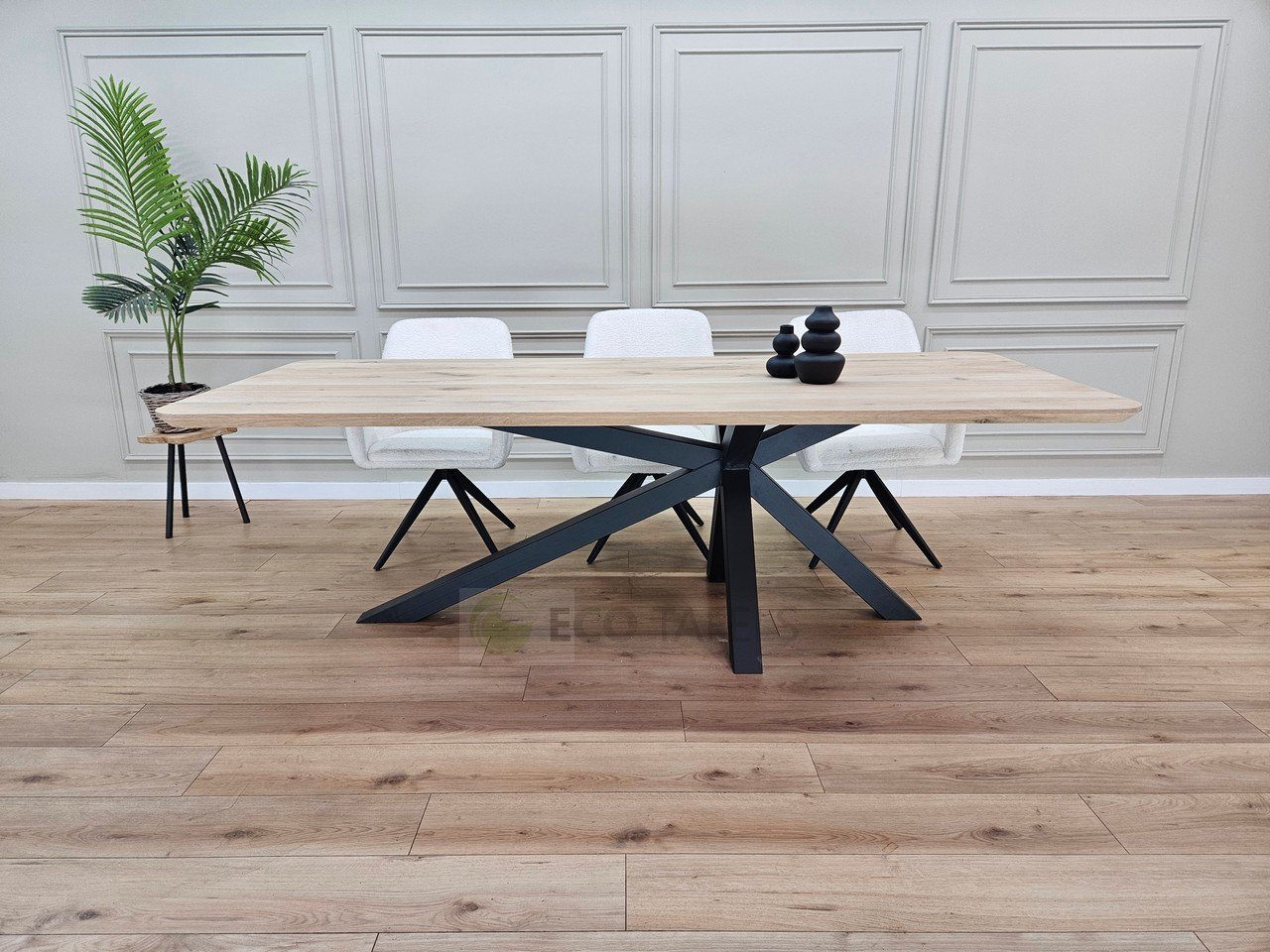 De eiken tafel met afgeronde hoeken met Matrix-K onderstel combineert de natuurlijke warmte van massief eiken met een modern, strak metalen frame. Het afgeronde tafelblad zorgt voor een zachte, toegankelijke uitstraling, terwijl het Matrix-K onderstel de tafel een stoere en stabiele basis geeft.